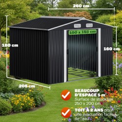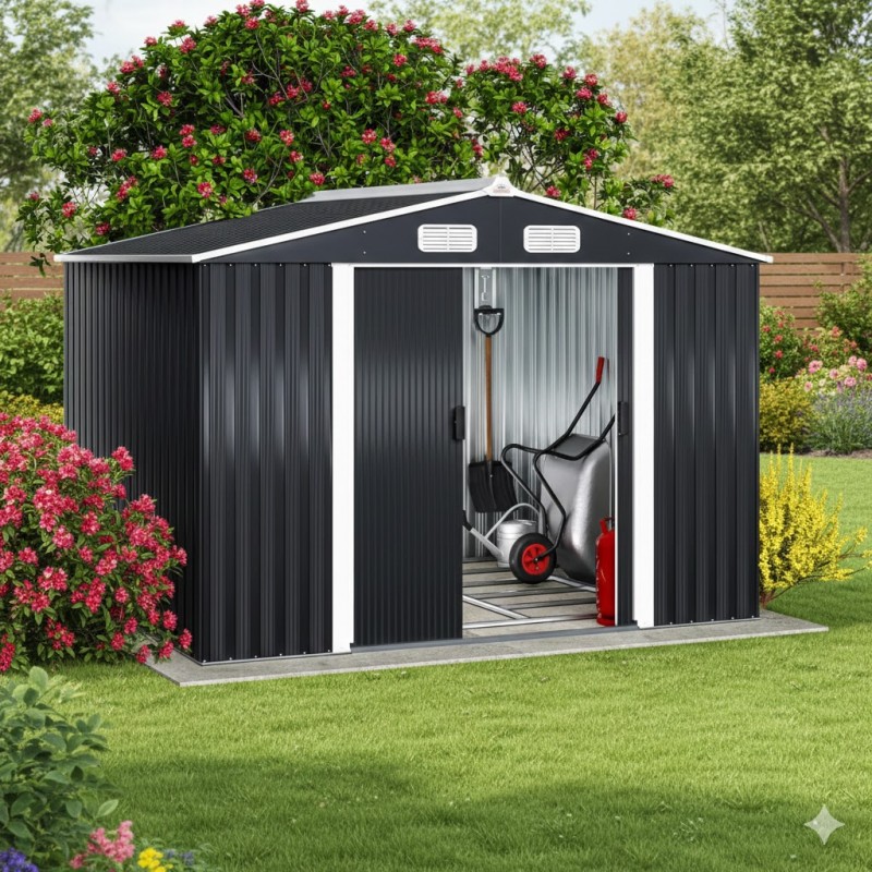 Rangez vos outils et équipements en toute sécurité grâce à cet abri de jardin robuste, offrant un espace généreux pour stocker vélos, outils et accessoires de jardinage. Son cadre de sol galvanisé permet l’installation d’un plancher en bois (non fourni) pour une meilleure isolation et une stabilité renforcée.