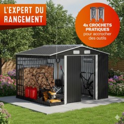 De plus, 4 crochets pratiques permettent de suspendre vos outils de jardin tels que pelles, râteaux ou sécateurs, avec une capacité maximale de 15 kg.
