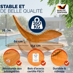 Cette chaise longue séduit par sa conception soignée et sa fabrication en bois d’acacia certifié FSC®, un matériau naturellement résistant aux intempéries. Elle convient aussi bien à une utilisation en intérieur qu’en extérieur.