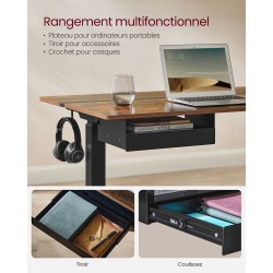 Un petit tiroir (22,7 x 32,5 x 4,0 cm) peut être utilisé pour les fournitures de bureau, le tiroir du haut pour glisser un ordinateur portable ou des documents et le crochet latéral pour accrocher les casques et les garder à portée de main.