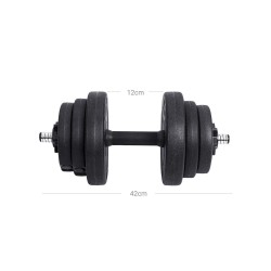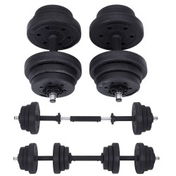 20 kg: 4 x 2,5 kg, 4 x 1,25 kg, 4 x 1 kg, 2 x Barre en fer, 4 x Verrou