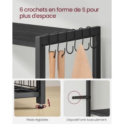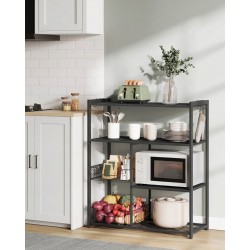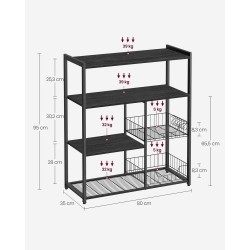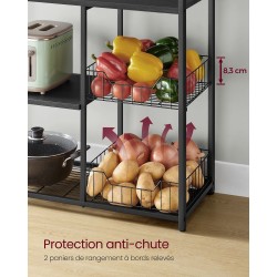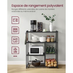 Que vous soyez un amateur passionné ou un véritable chef, l’organisation reste la base d’une cuisine efficace. Cette étagère de cuisine multiniveaux a été pensée pour offrir un espace de rangement généreux, capable d’accueillir aussi bien des boîtes de conserve que des assiettes. Elle est équipée de deux paniers métalliques en maille, d’une profondeur de 9 cm, parfaits pour les fruits, ainsi que de six crochets en S pour suspendre facilement vos ustensiles. Sa conception associe une structure en tubes de fer rectangulaires robustes à des étagères en bois d’ingénierie au fini brun rustique, créant un ensemble à la fois stable et esthétique. Les pieds réglables permettent d’assurer un bon équilibre, même sur un sol irrégulier. Avec des étagères profondes de 35 cm et bien espacées, elle offre suffisamment de place pour installer vos petits appareils électroménagers comme un four, une plaque de cuisson ou un grille-pain. Le montage est rapide et accessible grâce à des instructions illustrées et des pièces numérotées. Enfin, cette étagère s’inscrit dans une démarche pratique et fonctionnelle, idéale pour structurer votre espace cuisine au quotidien.